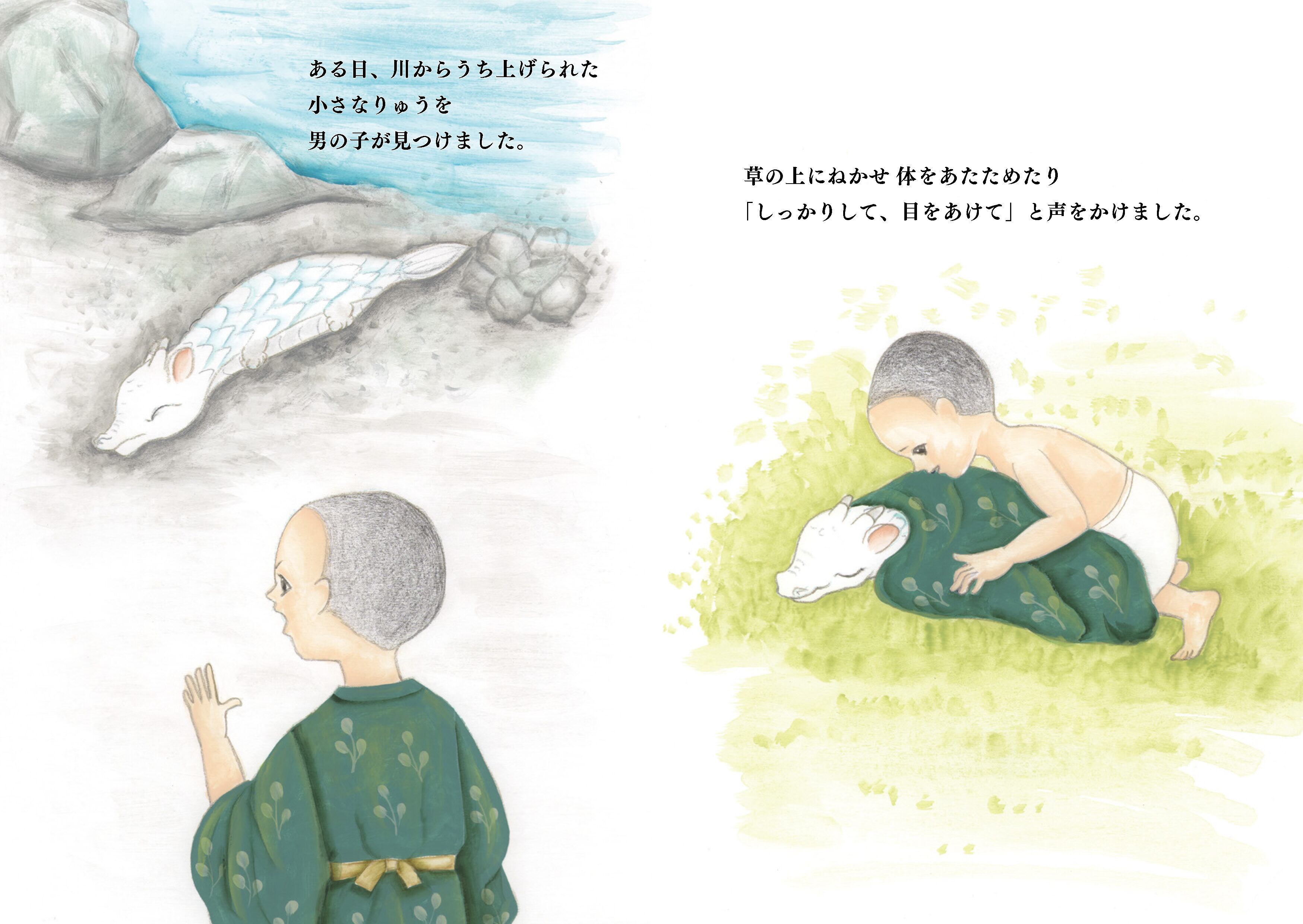 男の子ジンが川で見つけた小さな白いりゅう。それは、ふしぎな出会いのはじまりでした。