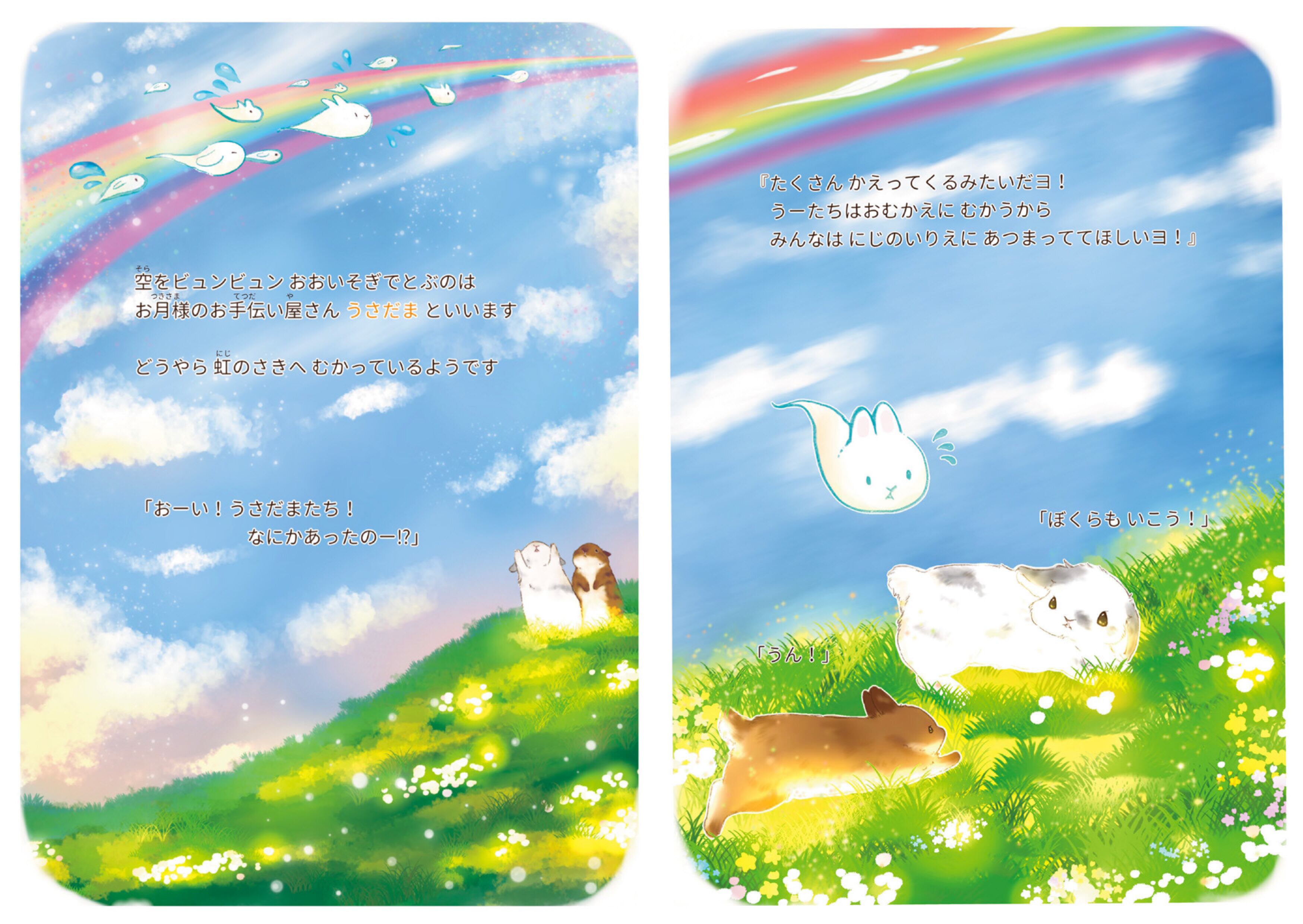 お月様の空にたくさんの虹がかかり、地球から還ってきたのは心と体に傷をおったうさぎ達⋯