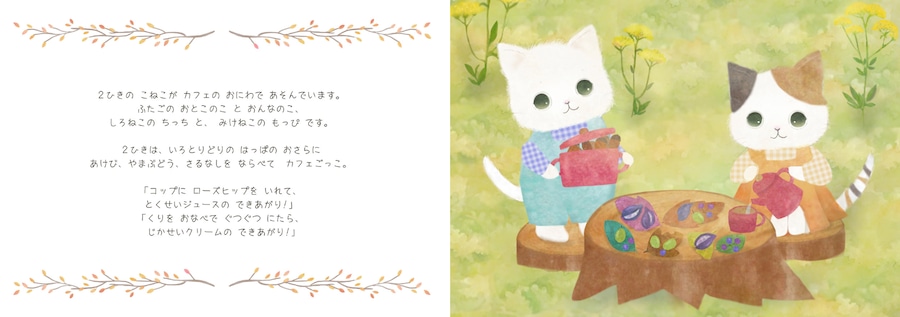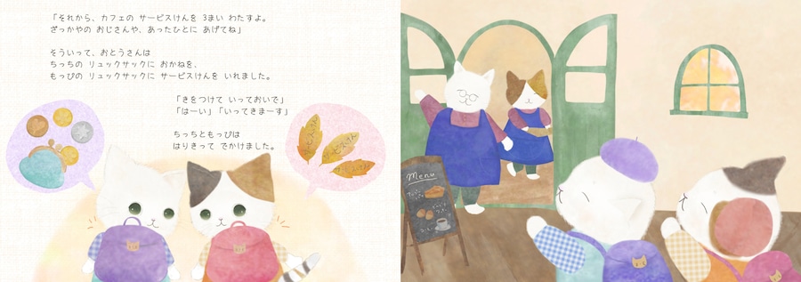 2匹のこねこが、カフェのお庭で遊んでいると、お父さんがやってきてー