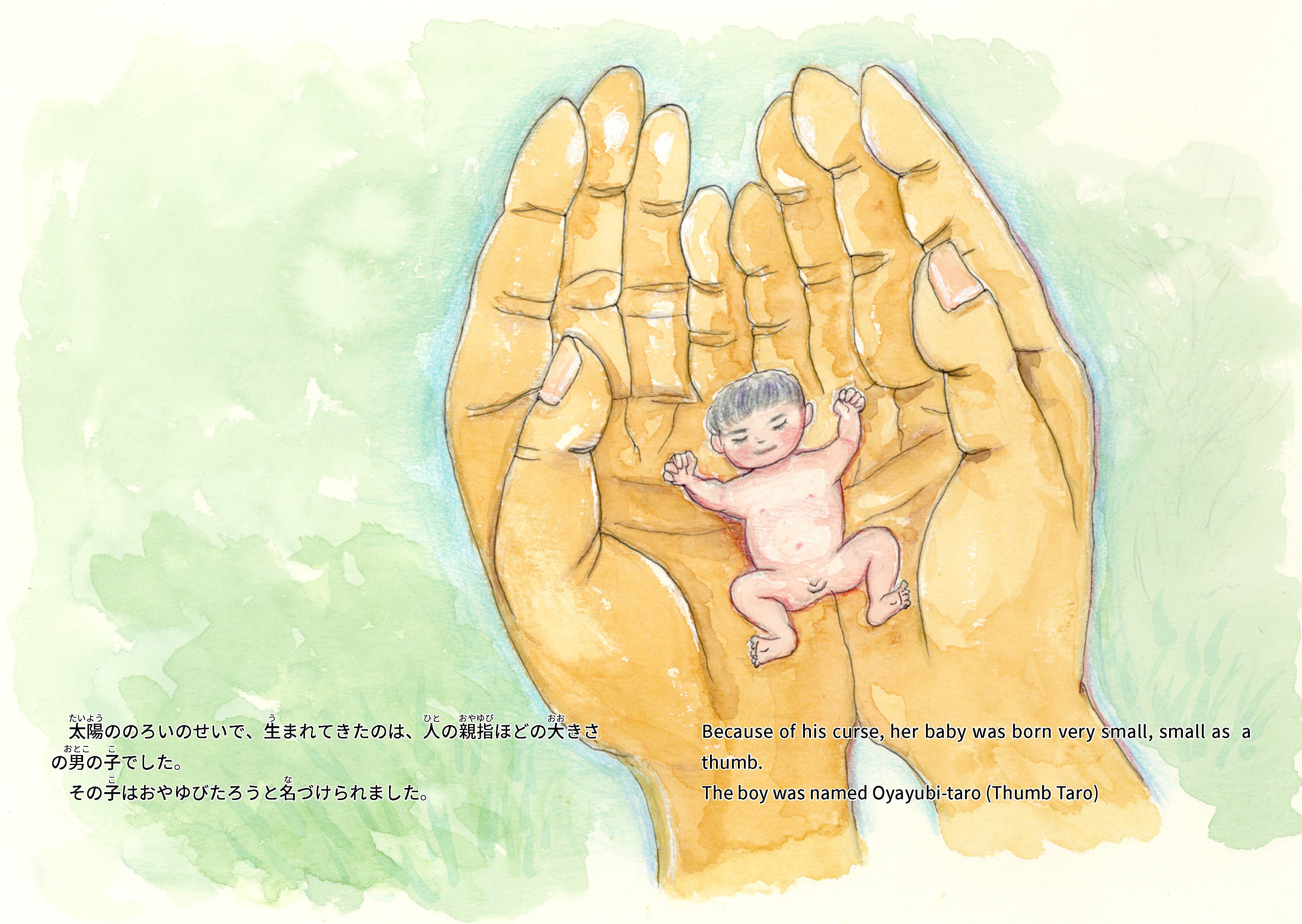 「おやゆびたろう」は日本の一寸法師、アンデルセンの親指姫、グリムの親指太郎などと同じ話型をもつ昔話で、小さく生まれた子が活躍する痛快なお話です。