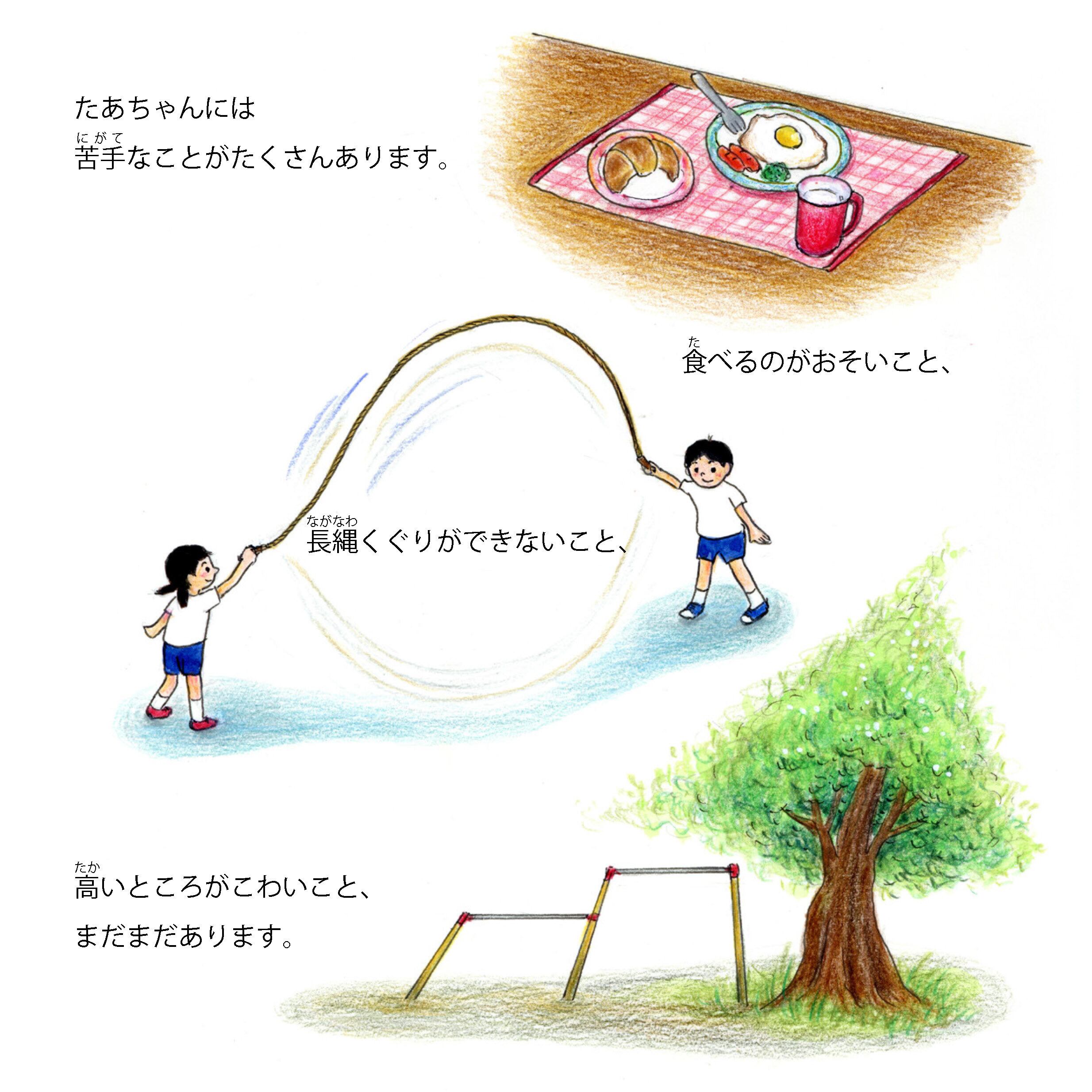 「仕方ない」のではなく、頑張りたいと思ったとき、挑戦したいと思ったとき、ちょっと勇気を出してやってみよう!周りを巻き込んで自分から変わって行こう!という思いを、牧山さちこさんの優しい絵にしてもらいました。