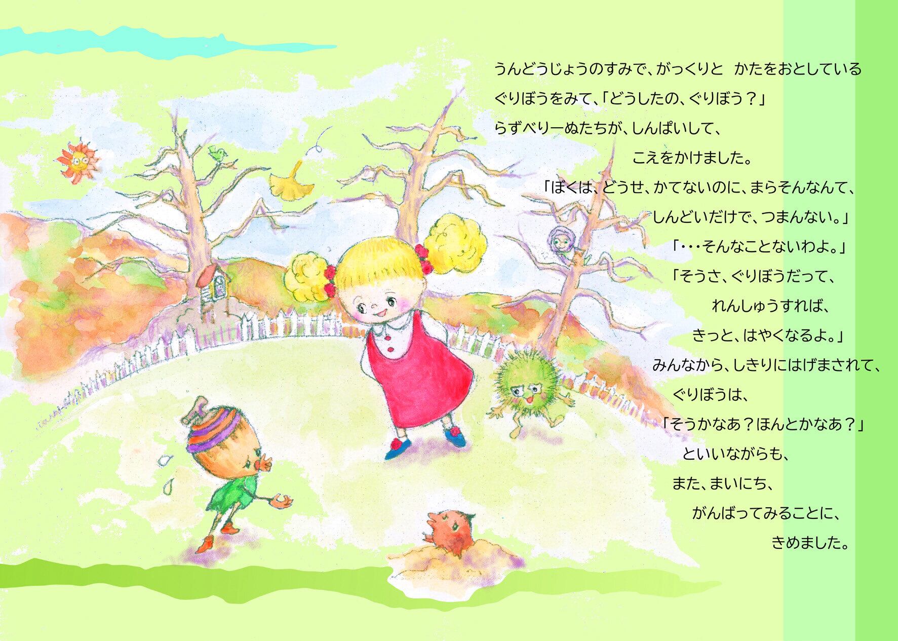 走るのが、不得意などんぐりのグリボウが、へこたれずに、マラソンに挑戦する。