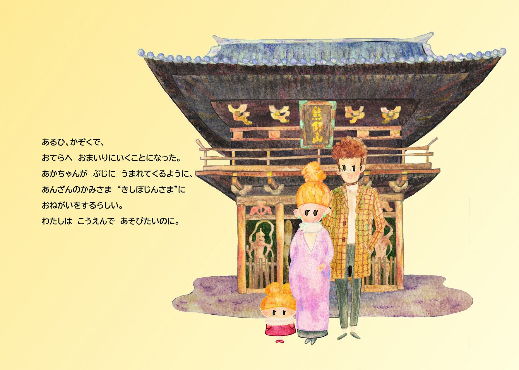 あかちゃんの、安産祈願に、お寺参りをする家族づれ。でも、話はあかちゃんの、ことばかりで、おねえちゃんの子は、すねてしまう。国宝の仁王門、重文のお仁王様も登場する。さて、どんな、冒険がおこるのか?